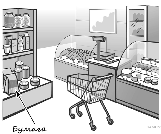 Рассмотри рисунок, на котором изображён продовольственный магазин. Упаковочный пакет сделан из бумаги. Он отмечен на рисунке стрелкой с соответствующей надписью.